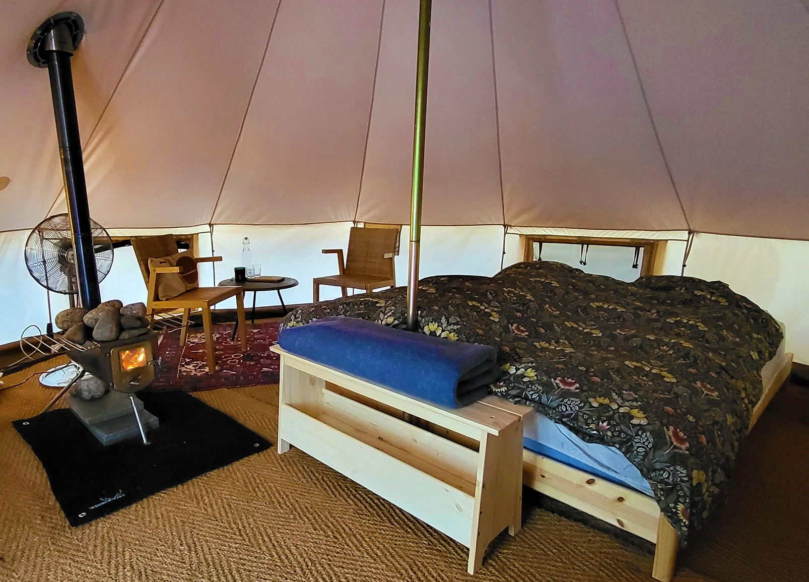 De tent is standaard ingericht voor drie personen, met een comfortabel twee persoonsbed en twee losse bedden die we op elkaar hebben gestapeld, zodat er ruimte is voor een zithoek. Wanneer je met vier personen komt zetten we de bedden los en zijn er nog twee losse stoelen in de tent. Ook hebben we een baby/peuter bedje tot de beschikking en is het mogelijk om de tent voor vier personen en een babybedje in te richten