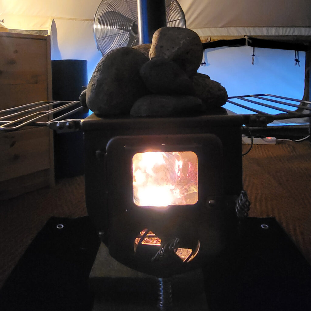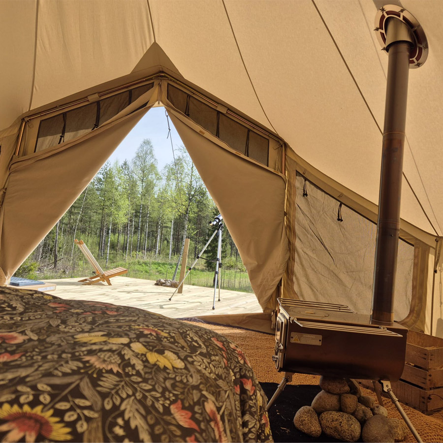De tent staat op een verhoogde houten vlonder waar je ’s avonds nog lang buiten zit, met uitzicht op de weide waar je geregeld hertjes, vossen of zelfs een eland kunt spotten. Uniek is de houtkachel in de tent: perfect voor frisse zomeravonden of zelfs een verblijf in de winter.